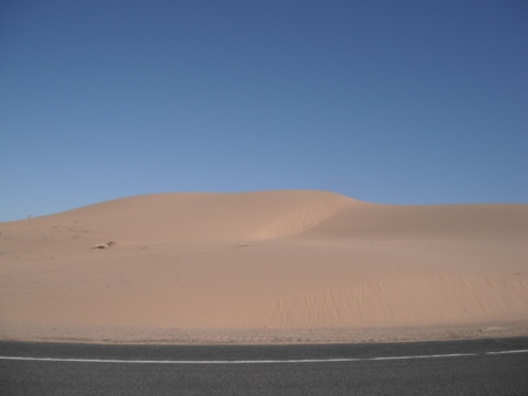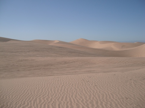 I left my off road campsite just after the sun came up, rode most of the way down the sandy wash (where I’d walked the bike in yesterday), and was on the road by 7am. I made pretty good time to the Glamis store, where I met the leader of a supported cross-country ride, the Wandering Wheelers. (Supported means a truck is carrying their gear, unlike me.) He was riding a scooter ahead of the bikers, though he himself had ridden across the country 43 times! As his lead rider cruised in, I headed out, with an invitation to lunch with their group. Almost immediately, the wind kicked up and I slowed down. Dan, the lead rider, caught up with me pretty quickly, and we chatted for a bit, even though he had to practically pedal backwards to go at my pace.