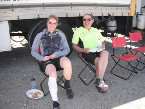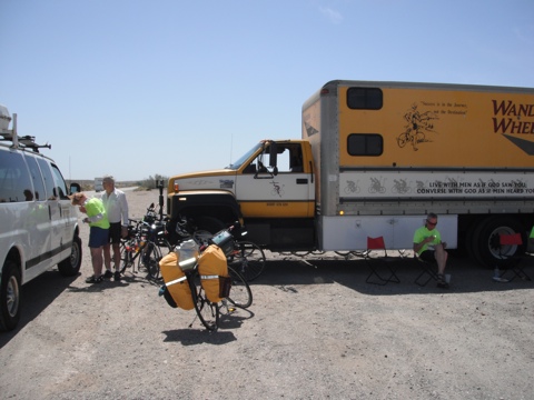 When I arrived in Palo Verde, the convenient store was closed, but I could see the Wheeler’s yellow support truck right off the road. I was glad they had invited me to camp with them, because it was at more of a mobile home park than a campground, so I didn’t have to worry about the organizing. Once again at dinner, I enjoyed being part of a group where we were all interested in the same crazy thing. We also had a good laugh over the pair that had turned back in the face of the headwinds earlier in the day. One of them had commented, “I’m 50 years old! I don’t want to have a heart attack!” This vibrant group, several in their 80′s, thought that was pretty rich.